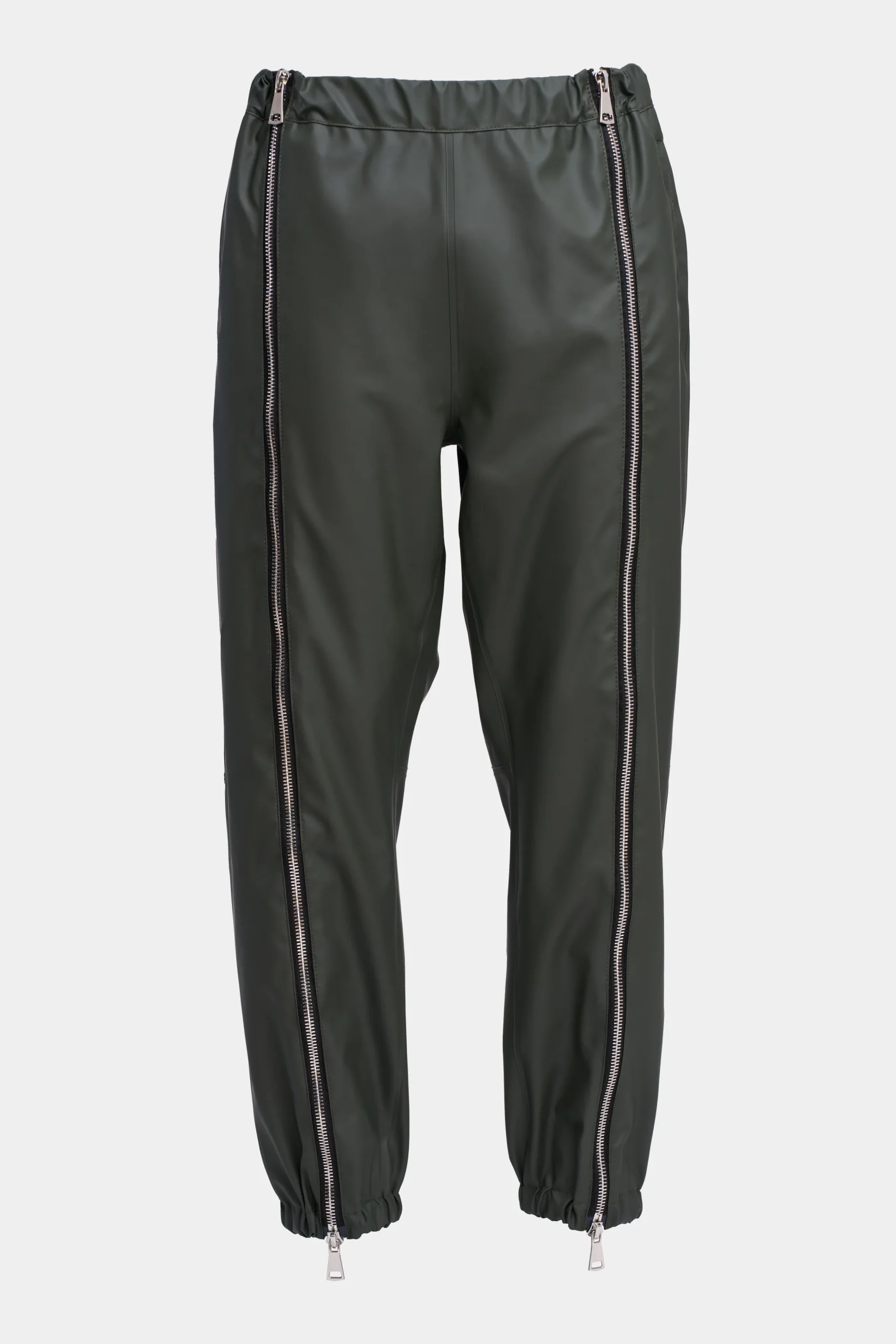 - Two-way silver metal front zip on each leg