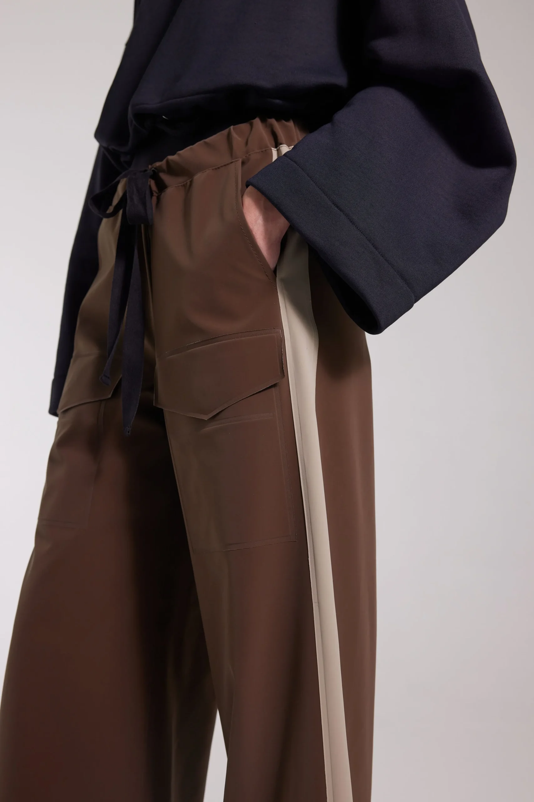 Jarla Stripe are coverall trousers for women in light and airy waterproof fabric with a matte finish and a contrast-coloured stripe down the side of each leg. Constructed with double-welded seams for complete rain protection, these trousers are perfect for staying stylish in wet weather. The high drawstring waist and wide leg add femininity and ease of movement as well as making the trousers quick and easy to transition in and out of.The front patch pocket on each leg and slanted single back pocket with an aqua guard zipper add practicality as well as a stylish touch.