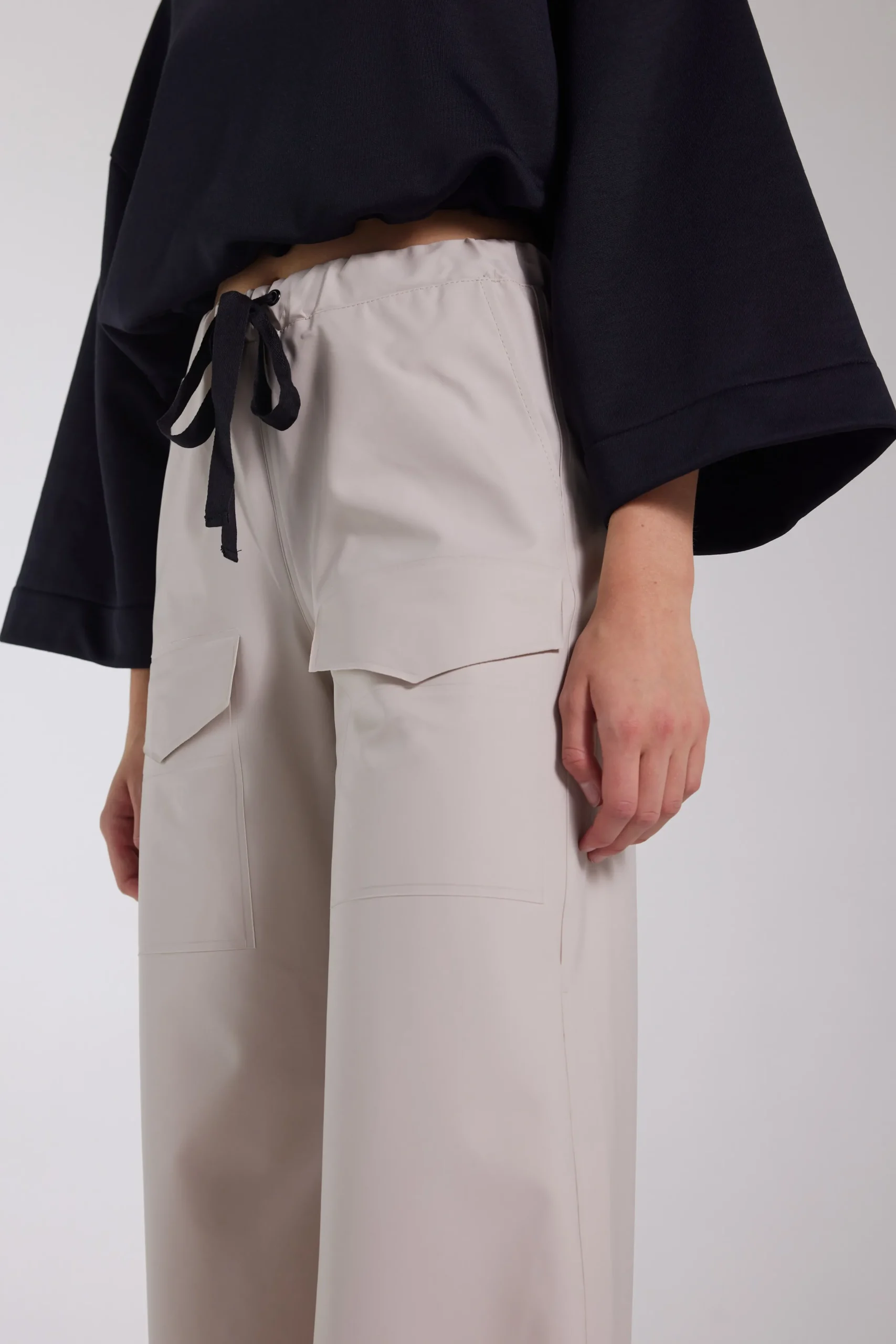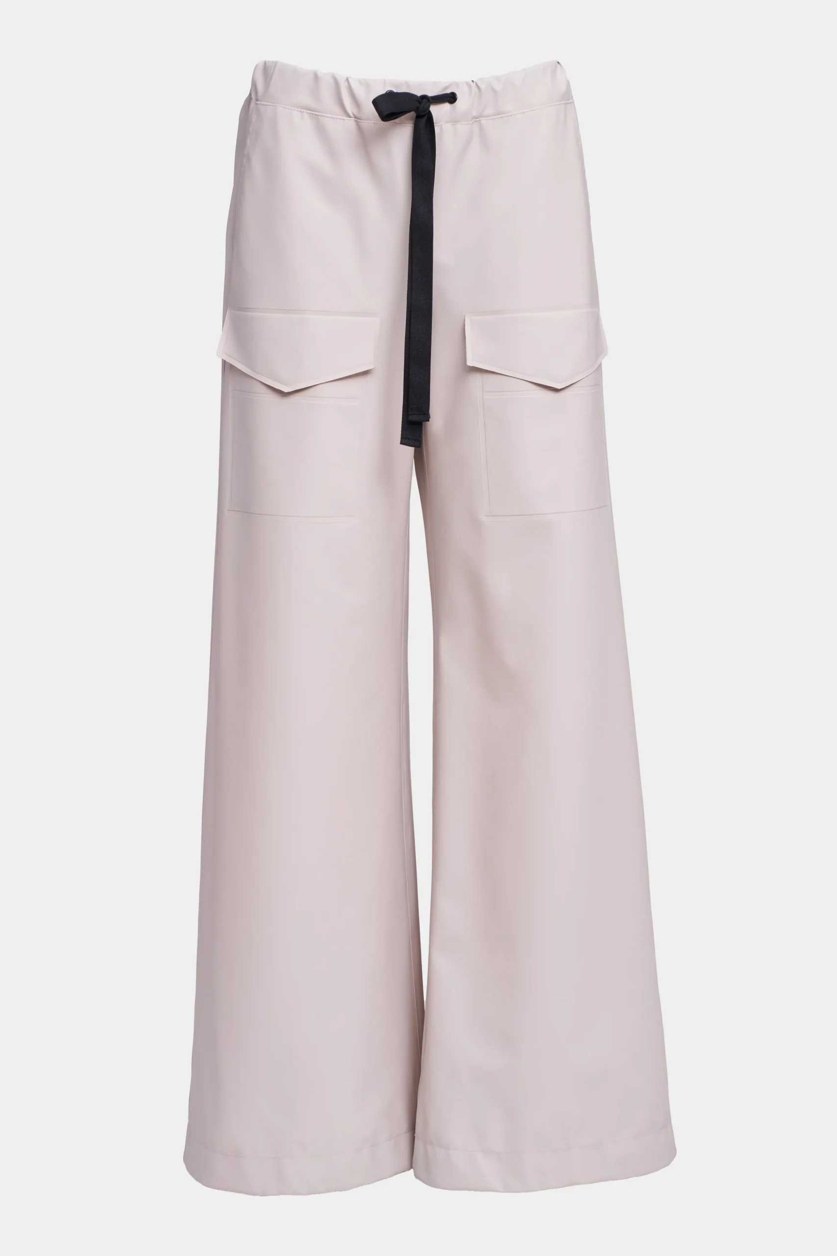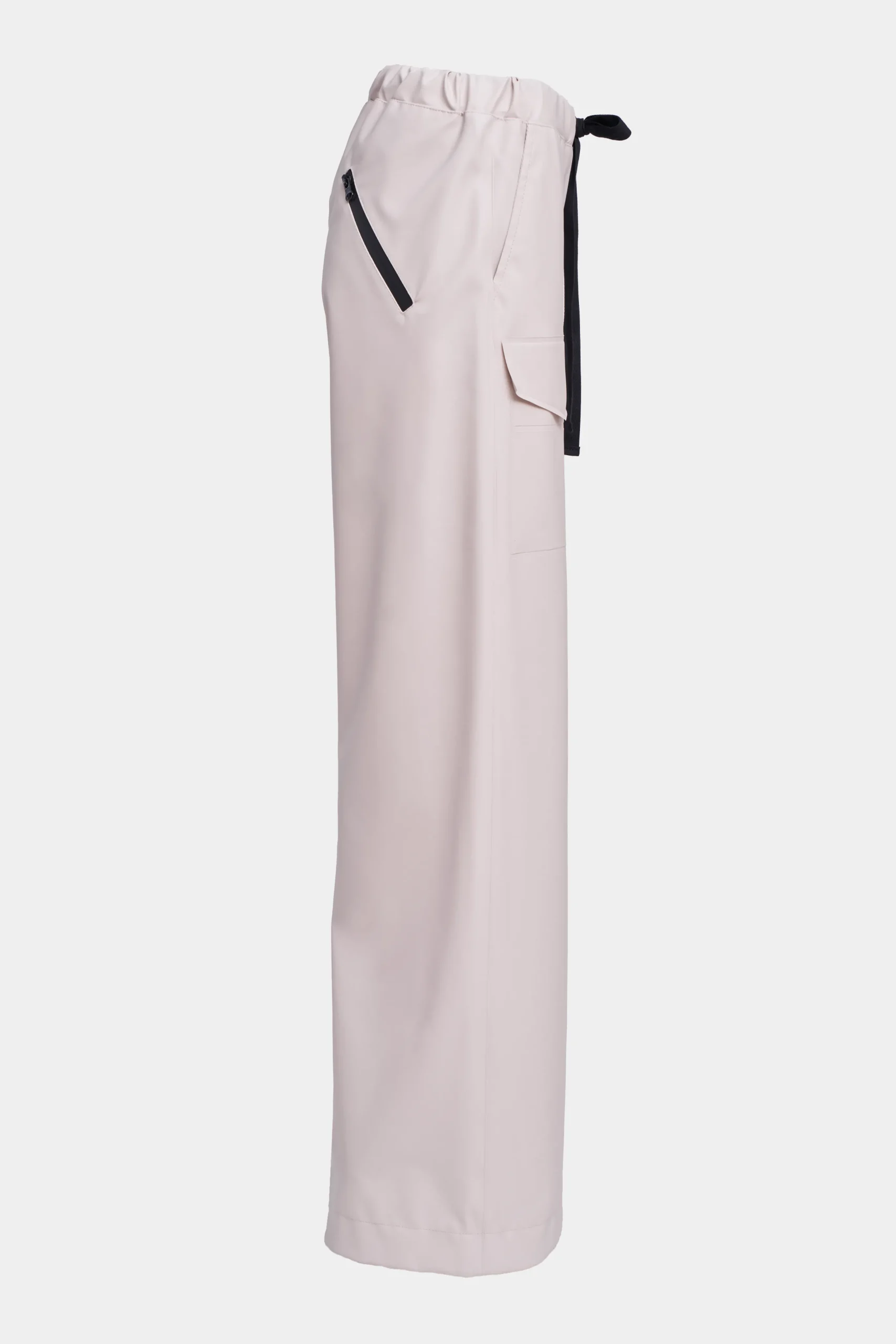 Jarla are coverall trousers for women in light and airy waterproof fabric. Constructed with double-welded seams for complete rain protection, these trousers are perfect for staying stylish in wet weather. The high drawstring waist and wide leg add femininity and ease of movement as well as making the trousers quick and easy to transition in and out of.The front patch pocket on each leg and slanted single back pocket with an aqua guard zipper add practicality as well as a stylish touch.
