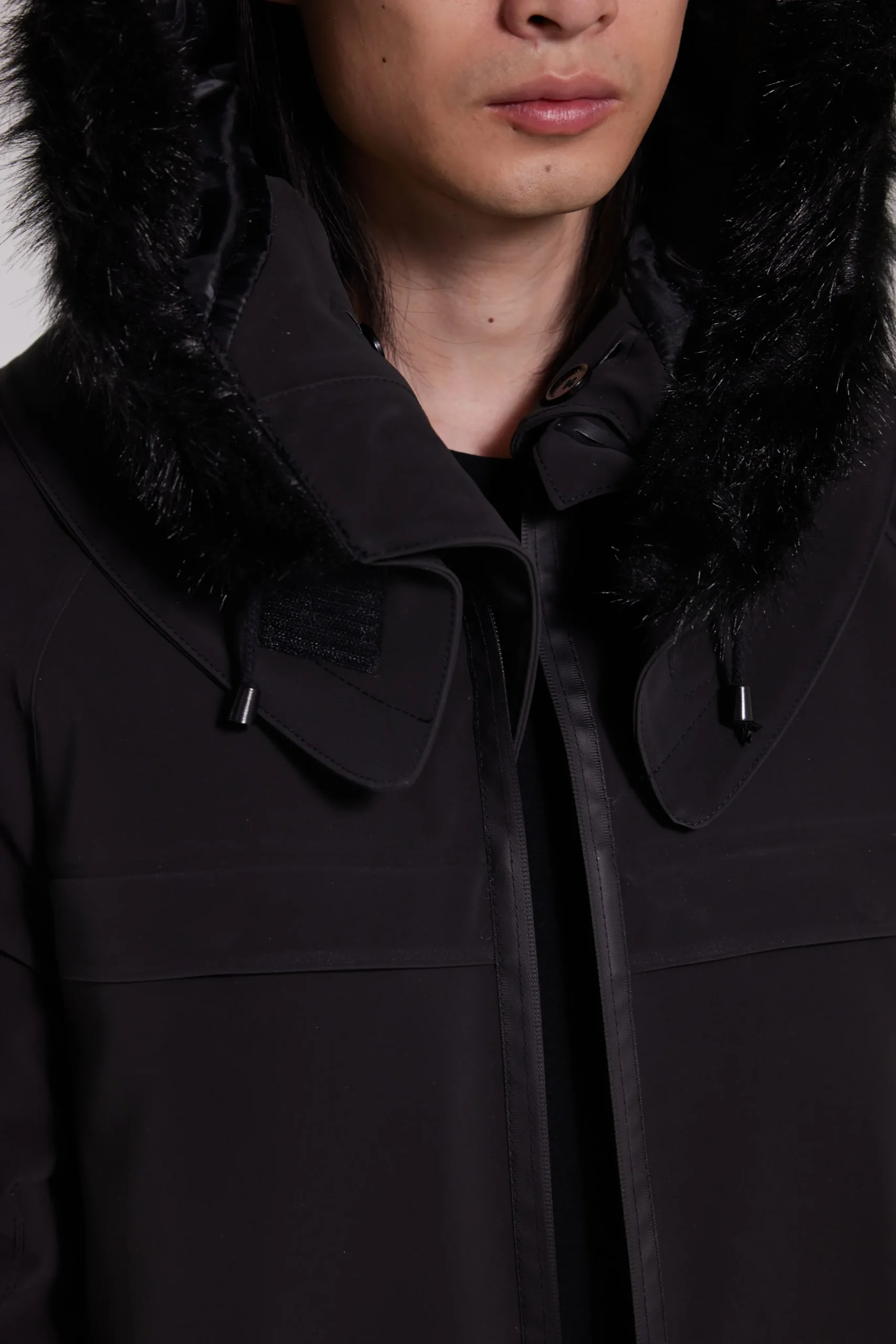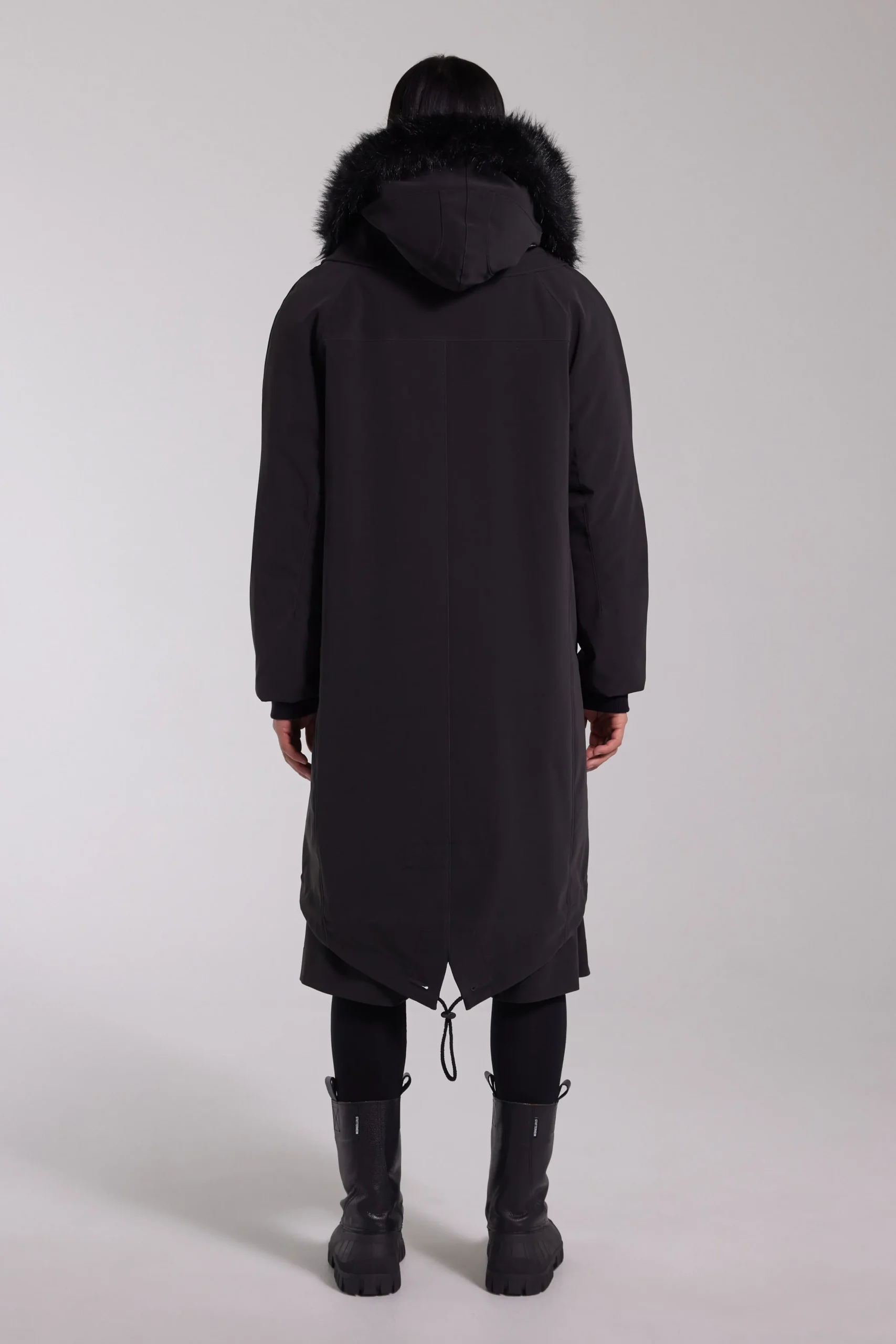 Kalix is a straight-fitting fishtail parka in sturdy and hard-wearing waterproof fabric. It’s insulated with padding for warmth during the winter season. Expertly made, this warm rain jacket is tailored with double-welded seams for complete protection against wet and cold weather. The detachable and adjustable collar and hood with a faux fur brim add extra comfort and warmth to the style.