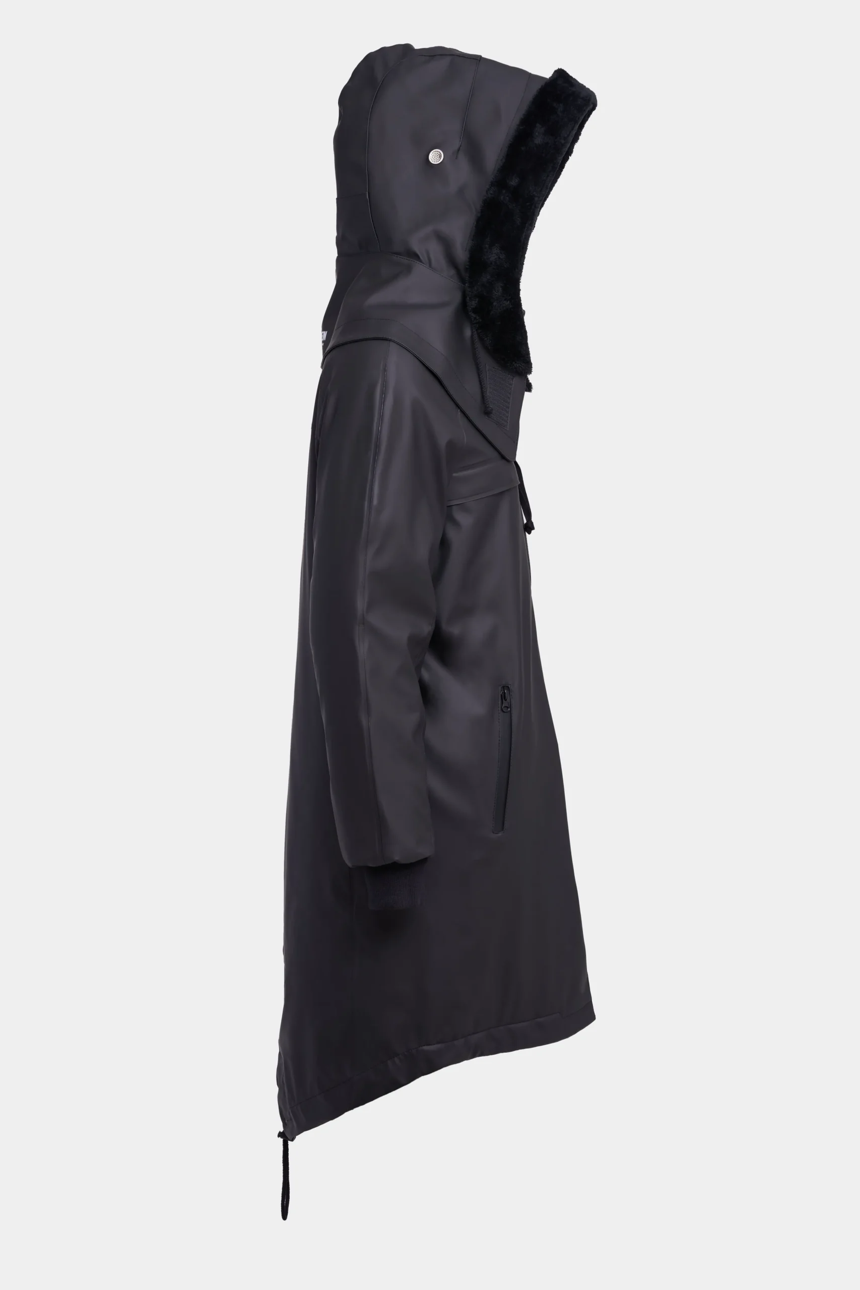 - Detachable hood with faux fur brim
