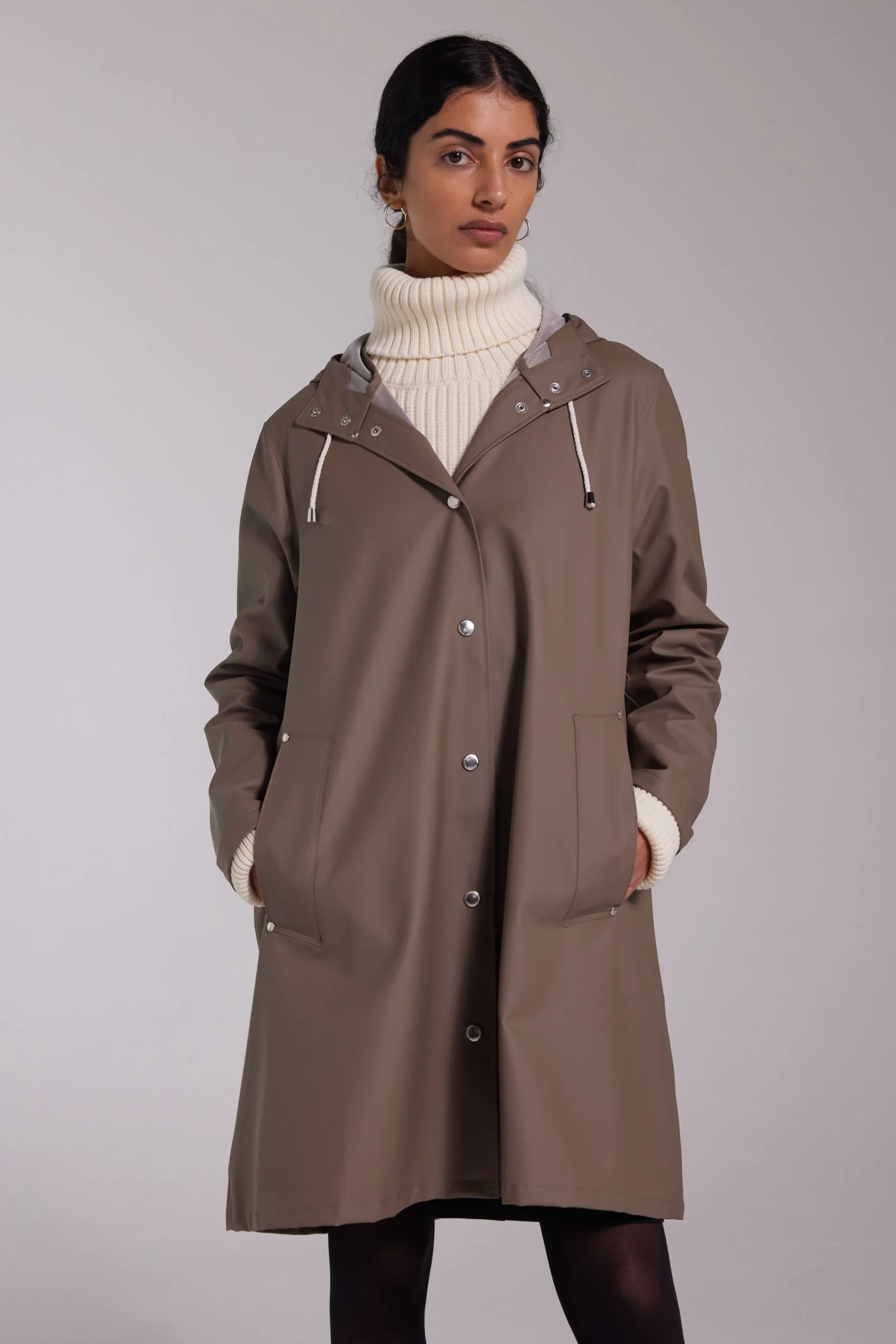 Mosebacke Lightweight is an artisanally made a-line-shaped raincoat for women. The ultra-light waterproof fabric is tailored with double-welded seams, making it impossible for any moisture to seep through. Ease of movement and comfort is achieved with under-arm eyelets and a drawstring hood. The thin and packable fabric makes this garment perfect in unpredictable weather and for travelling.