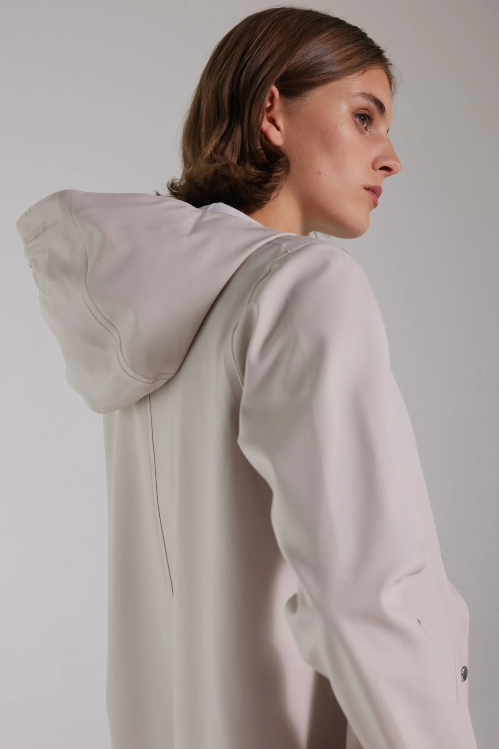 Mosebacke Long is an artisanally made knee-length and a-line-shaped raincoat for women. The sturdy and hard-wearing waterproof fabric is tailored with double-welded seams, making it impossible for any moisture to seep through. Ease of movement and comfort is achieved with under-arm eyelets and a drawstring hood.
