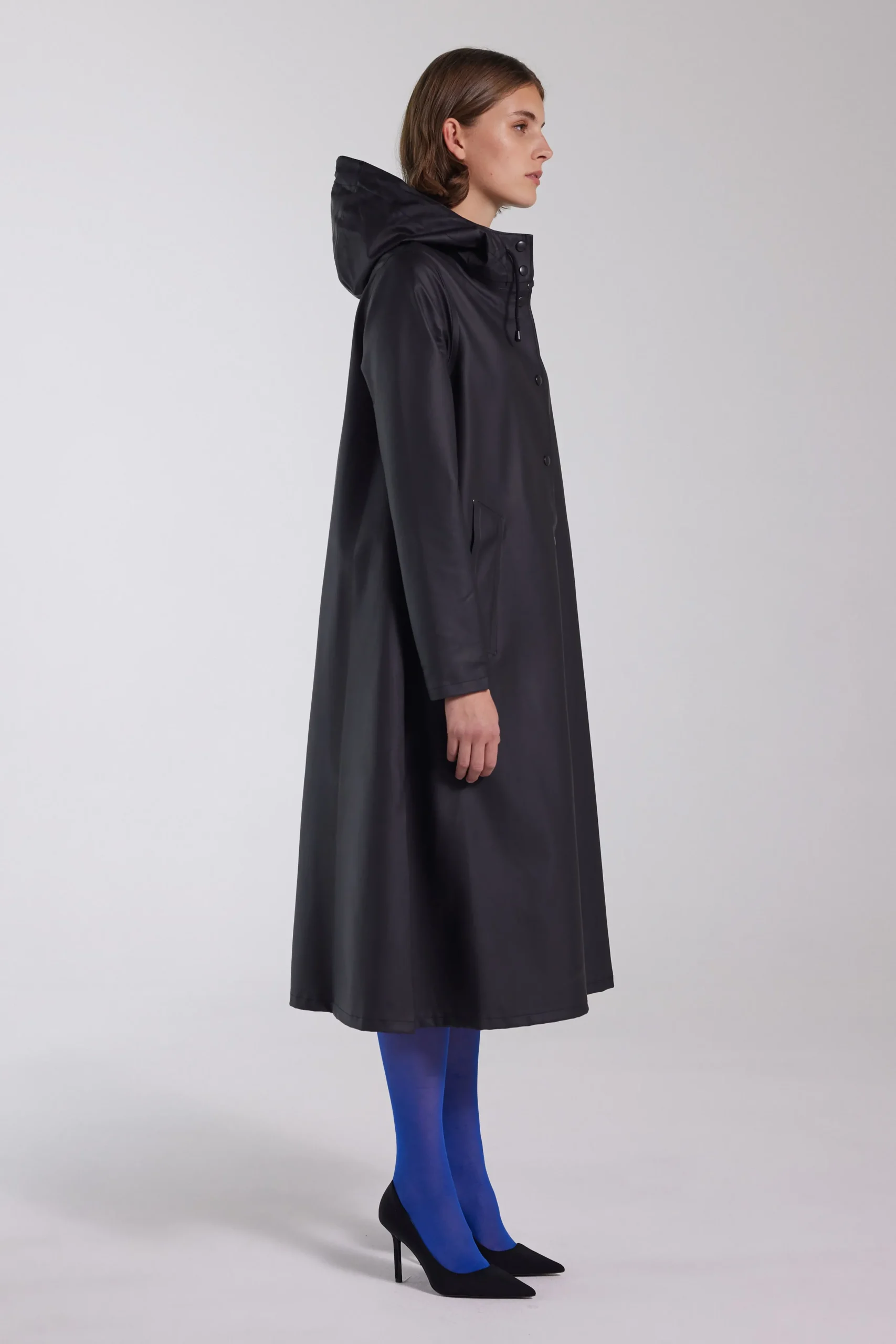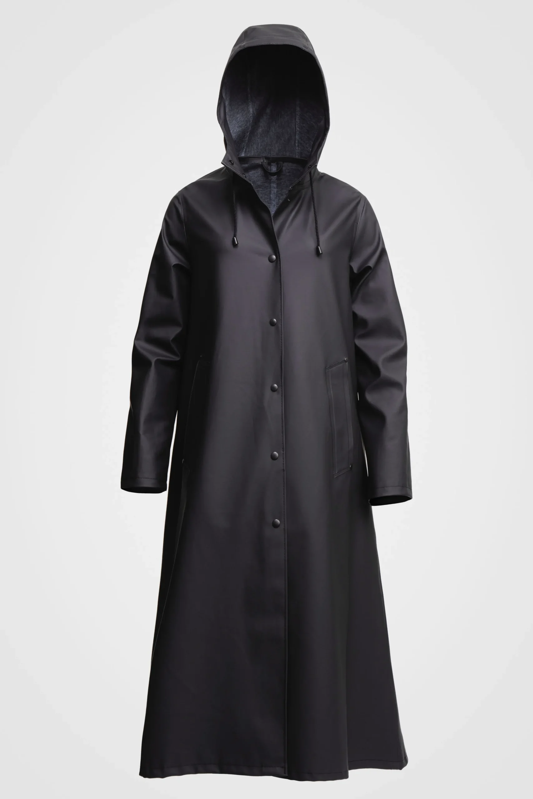 Mosebacke Long is an artisanally made knee-length and a-line-shaped raincoat for women. The sturdy and hard-wearing waterproof fabric is tailored with double-welded seams, making it impossible for any moisture to seep through. Ease of movement and comfort is achieved with under-arm eyelets and a drawstring hood.