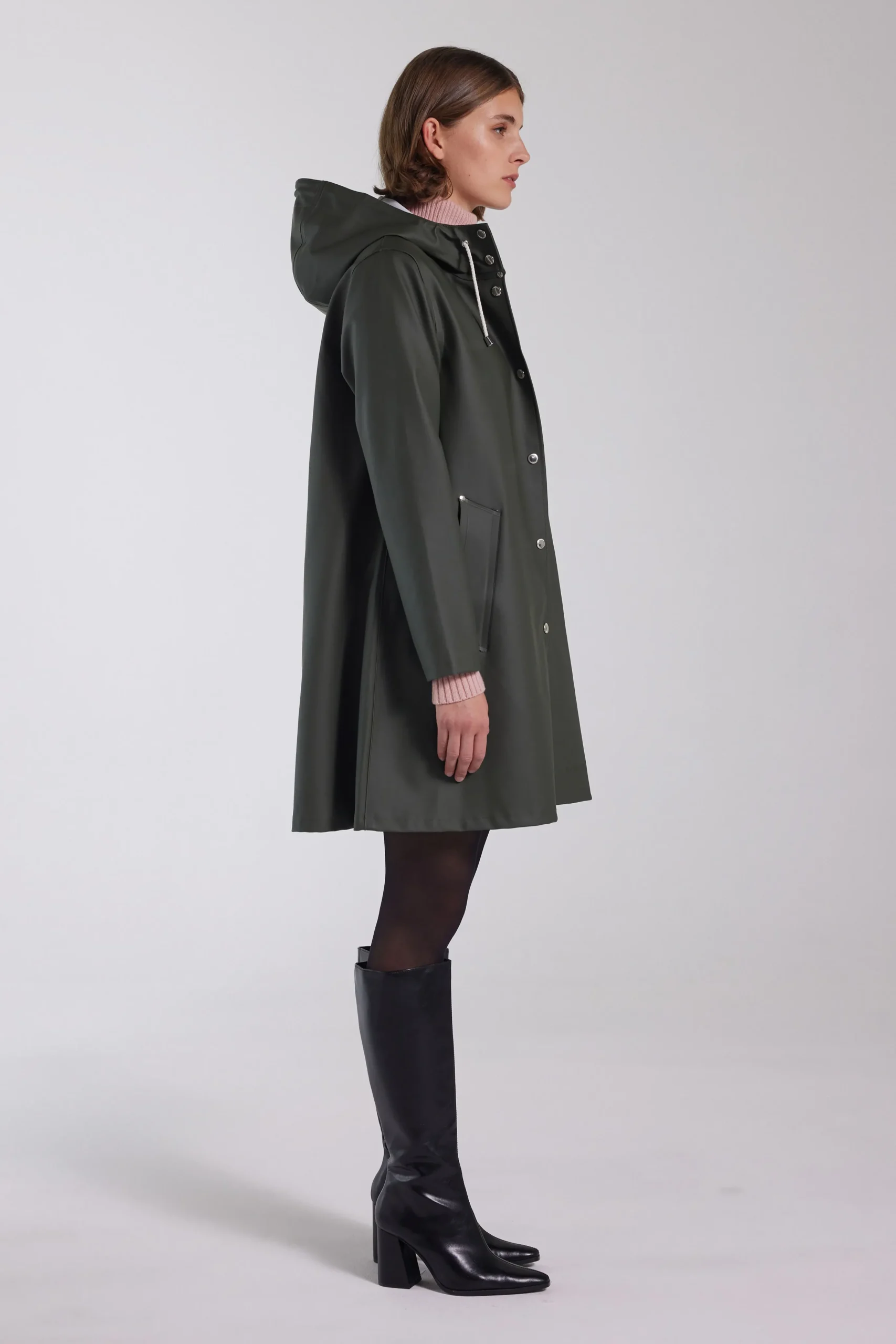 Mosebacke, a hilltop overlooking Stockholm and your top wardrobe staple, is an artisanally made a-line-shaped raincoat for women. The sturdy and hard-wearing waterproof fabric is tailored with double-welded seams, making it impossible for any moisture to seep through. Ease of movement and comfort is achieved with under-arm eyelets and a drawstring hood.