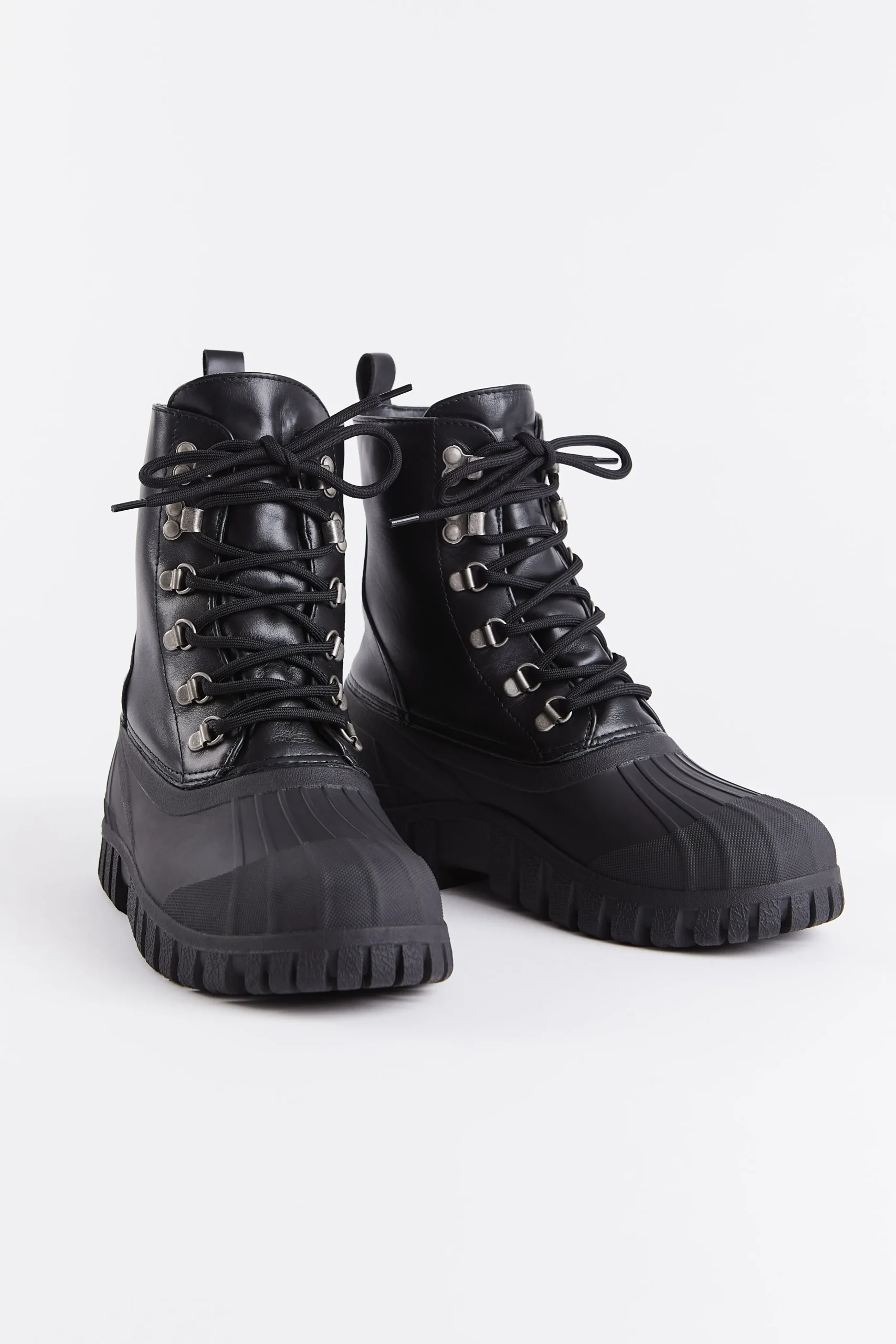 Patrol Boots are modern duck boots made for urban usage. Stylish as well as practical — a perfect trans-seasonal shoe suitable in spring and autumn, as well as winter when paired with warm socks or an added thermo sole. Constructed with a leather upper which has been treated to be water-repellent and a galosh-style duck sole, you can rest assured that your feet will be kept dry. The rubber lug sole ensures a firm grip on slippery ground and the padded ankle-length shaft adds warmth and comfort on days you need it the most.