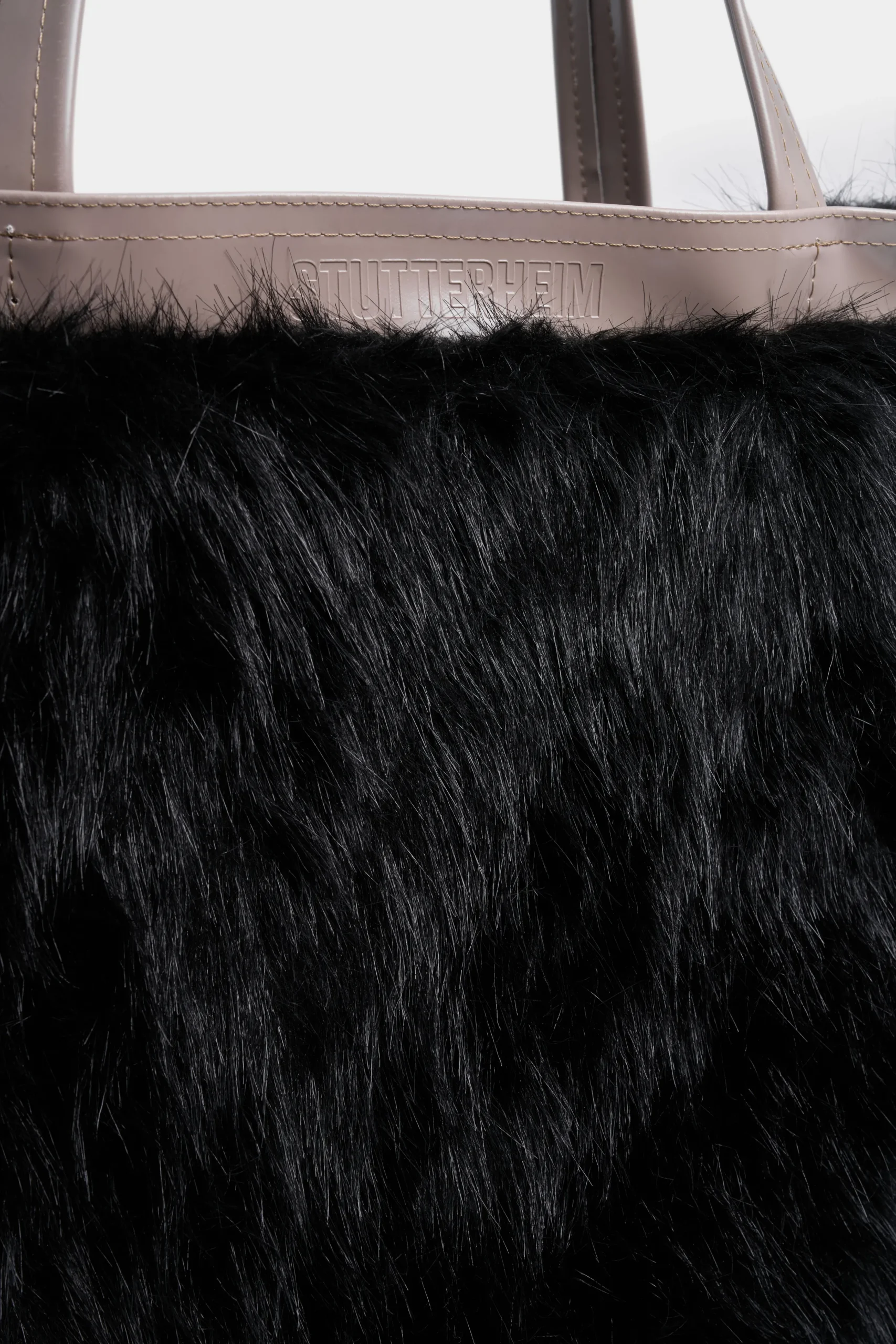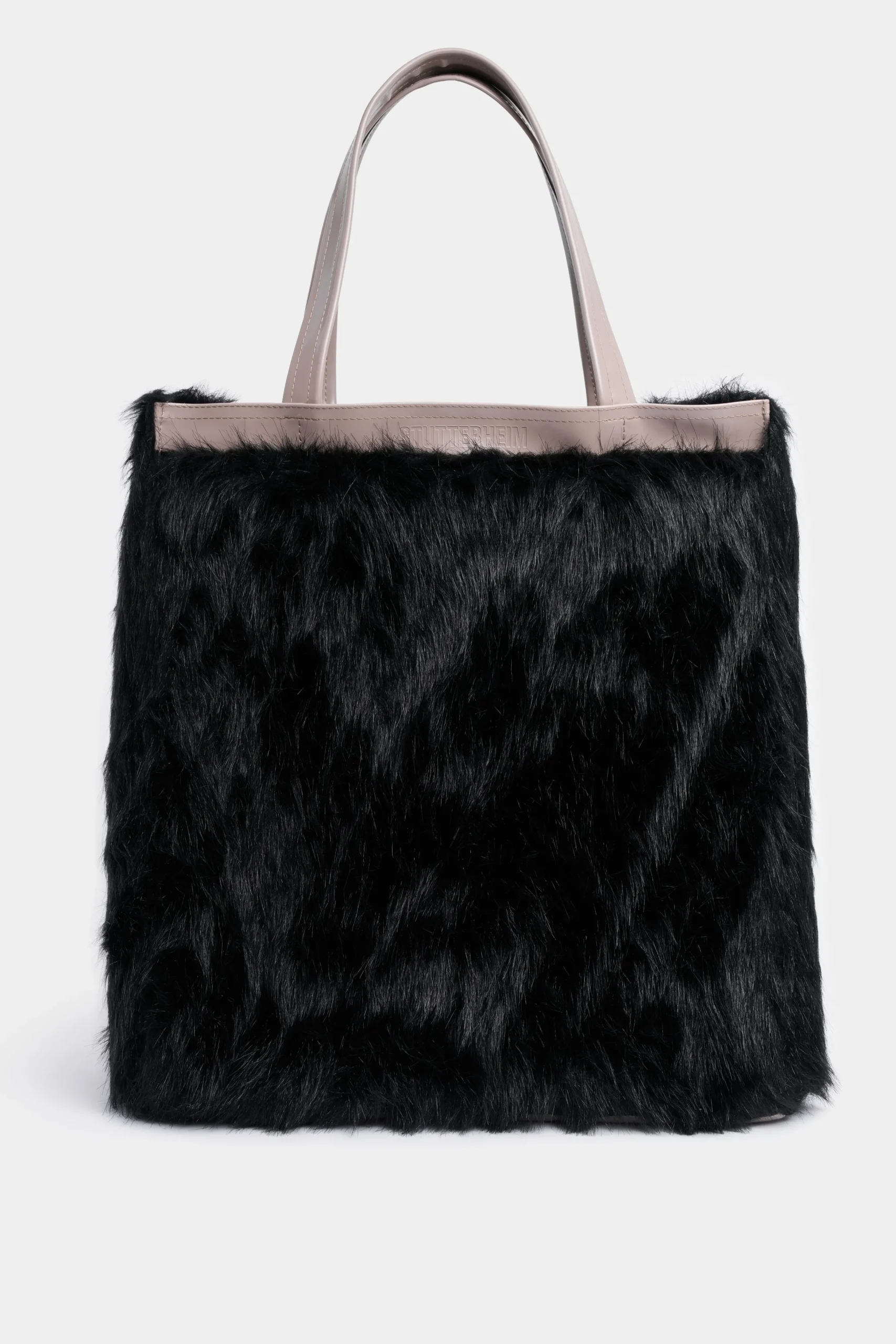 Stylist Faux is an extra-large tote bag covered in long-haired black faux fur. The base is crafted in dense and sturdy w…